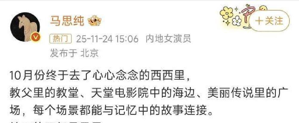 先从一个画面说起。阳光像金粉一样洒下来,海浪一层一层拍在礁石上,远处的复古教堂静静矗立。镜头一转,是在西西里海边尽情舒展身姿的马思纯。她晒出的那组照片——轻松、自在,“旧梦得圆”的喜悦几乎要从屏幕里溢出来。
